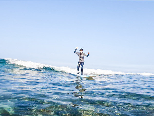 嬉しいことに沖合で波に乗って、海の途中で波が終わるんです。