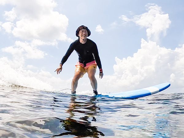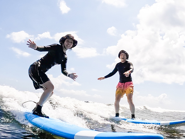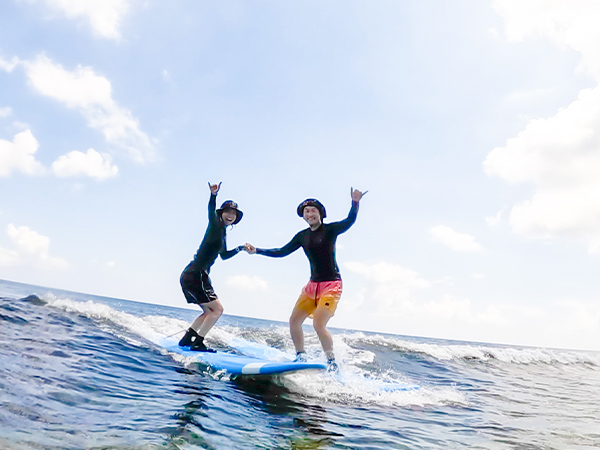 They hold hands and share a wave happily (^^) This is Okinawa surfing, isn’t it? 👏 A couple of surfers with different stances ♪ If their main stances are different, they can catch waves opposite each other when they stand up on their boards 👍 It’s fate that they can do this kind of surfing~♪ By the way, the Naha couple have a Goofy stance, so they can’t catch waves opposite each other (lol). Sometimes Tsubasa can switch and catch the wave, though…😂 If you’re a couple with different stances, please give it a try ☺️🤙