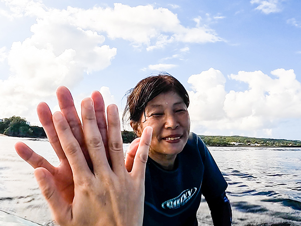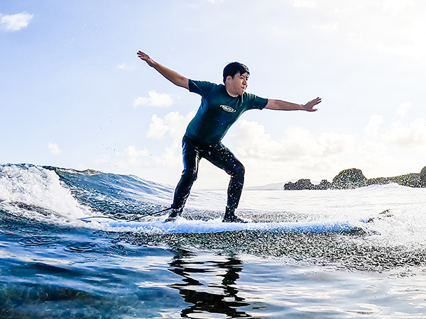 This customer is an active surfer in his 60s. He catches the swell, feels the wave, and strives for the fastest takeoff. He’s graduated from the soup ride of catching a breaking wave and now takes off from a green wave. It’s all about the push-up. Most surfers focus on the movement after takeoff, but in fact, the most important thing is to take off from the highest position and gain priority control of the board as quickly as possible. After that, he feels his body blend with the wave, and adjusts his speed to match the rhythm of the wave. This is a miracle that takes years to achieve, but in Okinawa’s ocean and with an instructor, some people can master it in just a few hours. There’s plenty of practice like this to do on reef breaks. Of course, the smaller the waves, the easier it is to understand and the safer you can try again and again. Learn about the characteristics of Okinawa’s reef breaks, hone your surfing skills, and have a great time surfing! (^^)