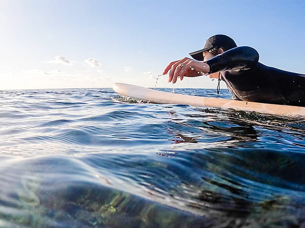 While waiting for waves, your reflection, the clouds, and the sky are visible on the water’s surface.
