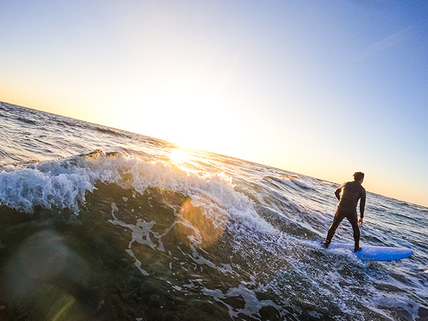 水平線から昇る朝日を見ながら、波が押し寄せる瞬間を狙いながら。