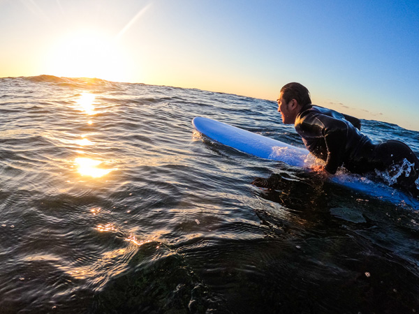 朝日が昇る15分前から辺りは薄明るく、海岸線も見えるためパドルアウトできます。