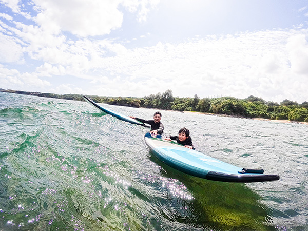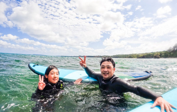 沖縄サーフガイド | 親子で沖縄ビーチで最高サーフィン!!一緒の波に乗れるパーティーウェーブがステキ!
